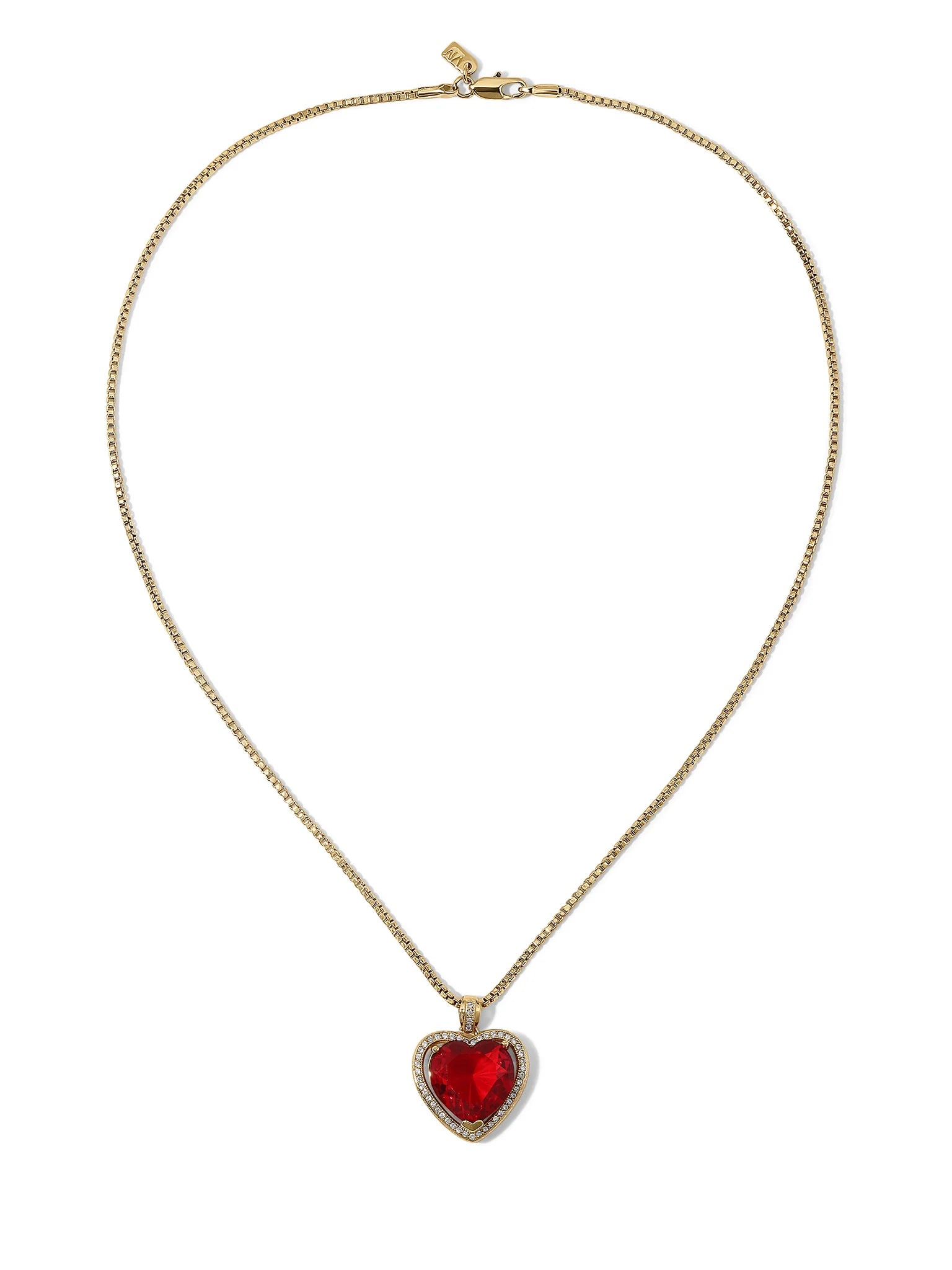 Features a dainty box-chain necklace with a large faux-ruby heart charm surrounded by crystal CZs. Made from 18K gold-plated brass and finished with a lobster clasp closure.